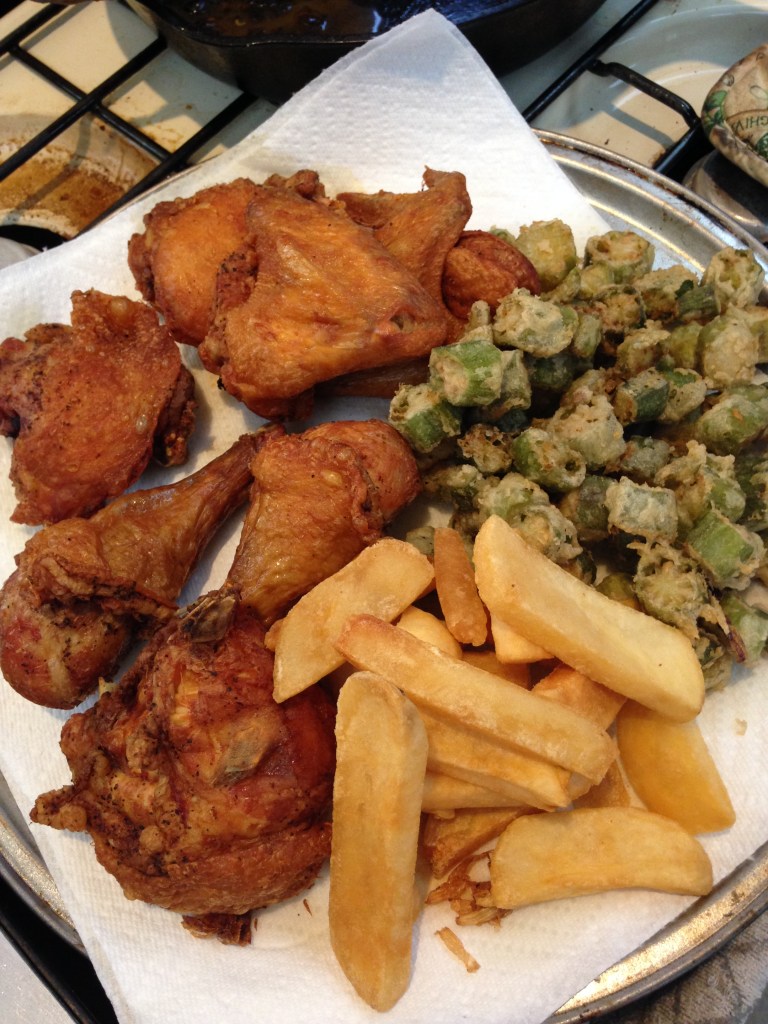 Filipino fried chicken is different from American southern fried chicken in that it is not breaded or floured but it is seasoned or marinated prior to frying. It is similar in taste to Cajun deep-fried turkey on Thanksgiving where you inject it with garlic butter solution that also contains vinegar.