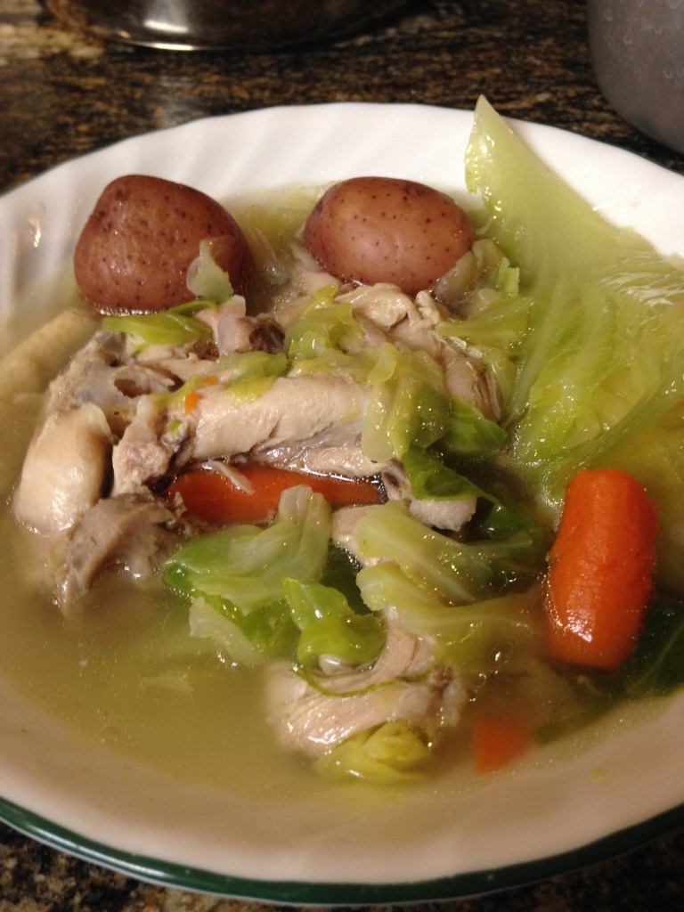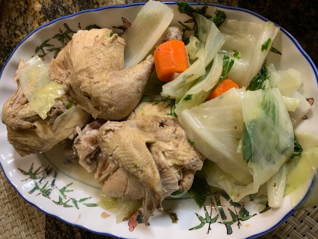 Put the chicken in a pot and cover with water. Add a couple of bay leaves and 2 teaspoons salt and a few whole black peppers. Heat to boiling, skim off the scum when it starts to boil, then simmer covered for about 15 minutes or until chicken is done but not falling apart. Add two green onions cut 2 inches, carrots and new potatoes if desired. Let it simmer again for a few more minutes then check if the potatoes and carrots are done. Add the cabbage when the other vegetables are cooked. Let it boil again then turn the heat off or remove from heat. Taste, add more salt if needed and add MSG (1/2 tsp.) if desired. Try not to overcook the cabbage.