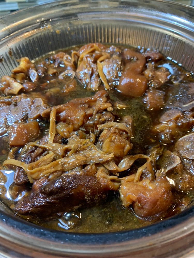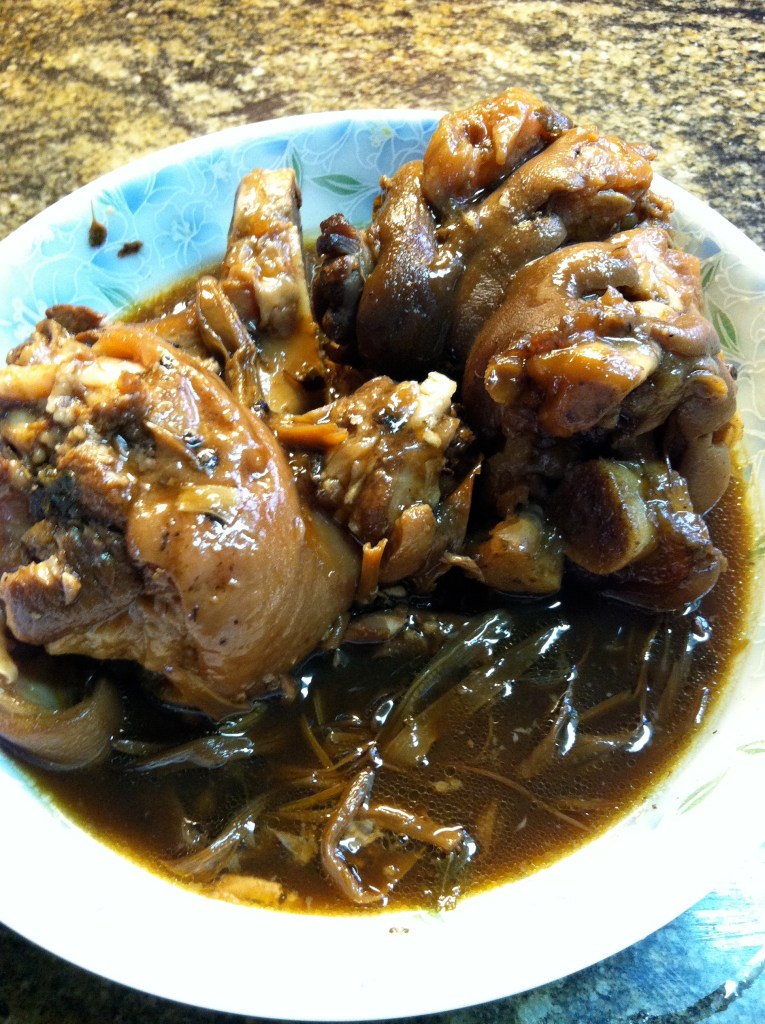 It is the pork skin on the leg that makes this dish so good. When it is cooked to tenderness, the skin becomes so tender and jelly-like that it just melts in your mouth. The gravy or the sauce is gelatinous that comes from the collagen from the tendons, connective tissues and the bones.
