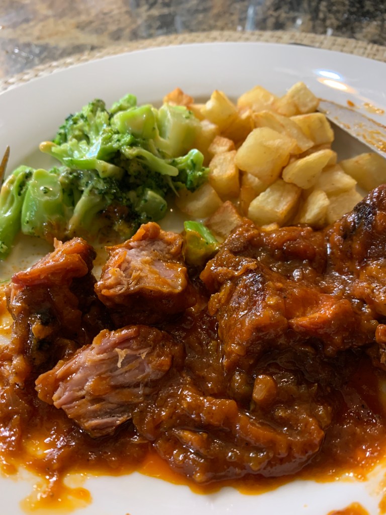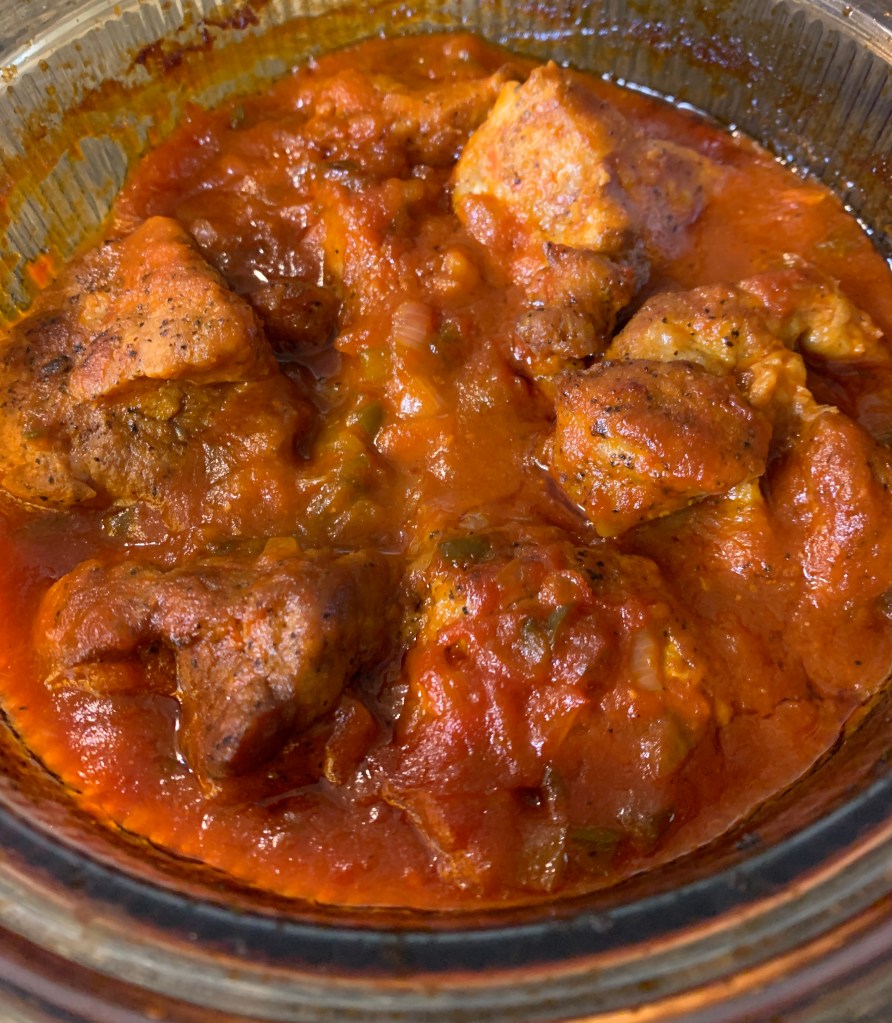 Pour this sauce over the pre-grilled pork in the Dutch oven or baking pan. Cover and simmer for about 1 hour or until very tender, stirring occasionally to prevent sticking or burning on the bottom.