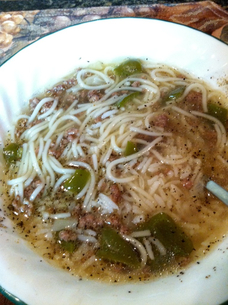 This soup is a comfort food as far as I am concerned. You can make it with rice, Fideos or broken up angel hair spaghetti, about 1″ to 2″ long.