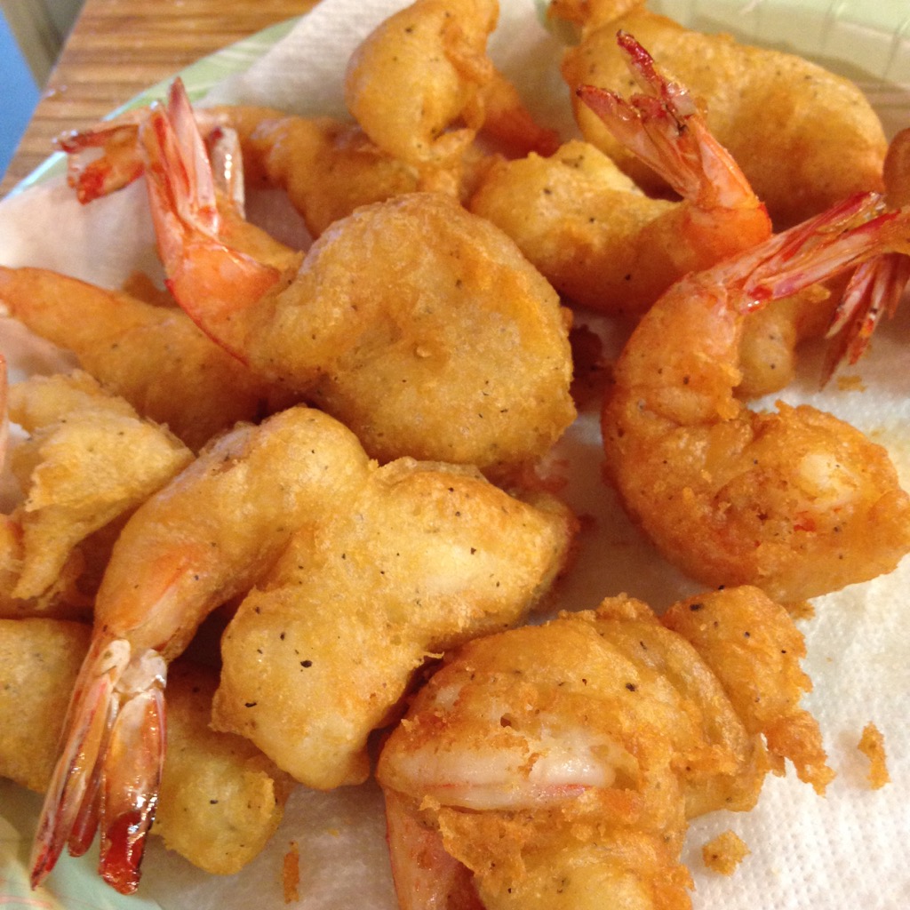 Heat oil in a pan for deep-frying, preferably to 375° F. Hold each shrimp at the tail and dip in the batter. Touch the side of the bowl to drain excess batter then drop in the hot oil one at a time. They should float and are done but leave a little longer to desired brownness. Do them in batches.
