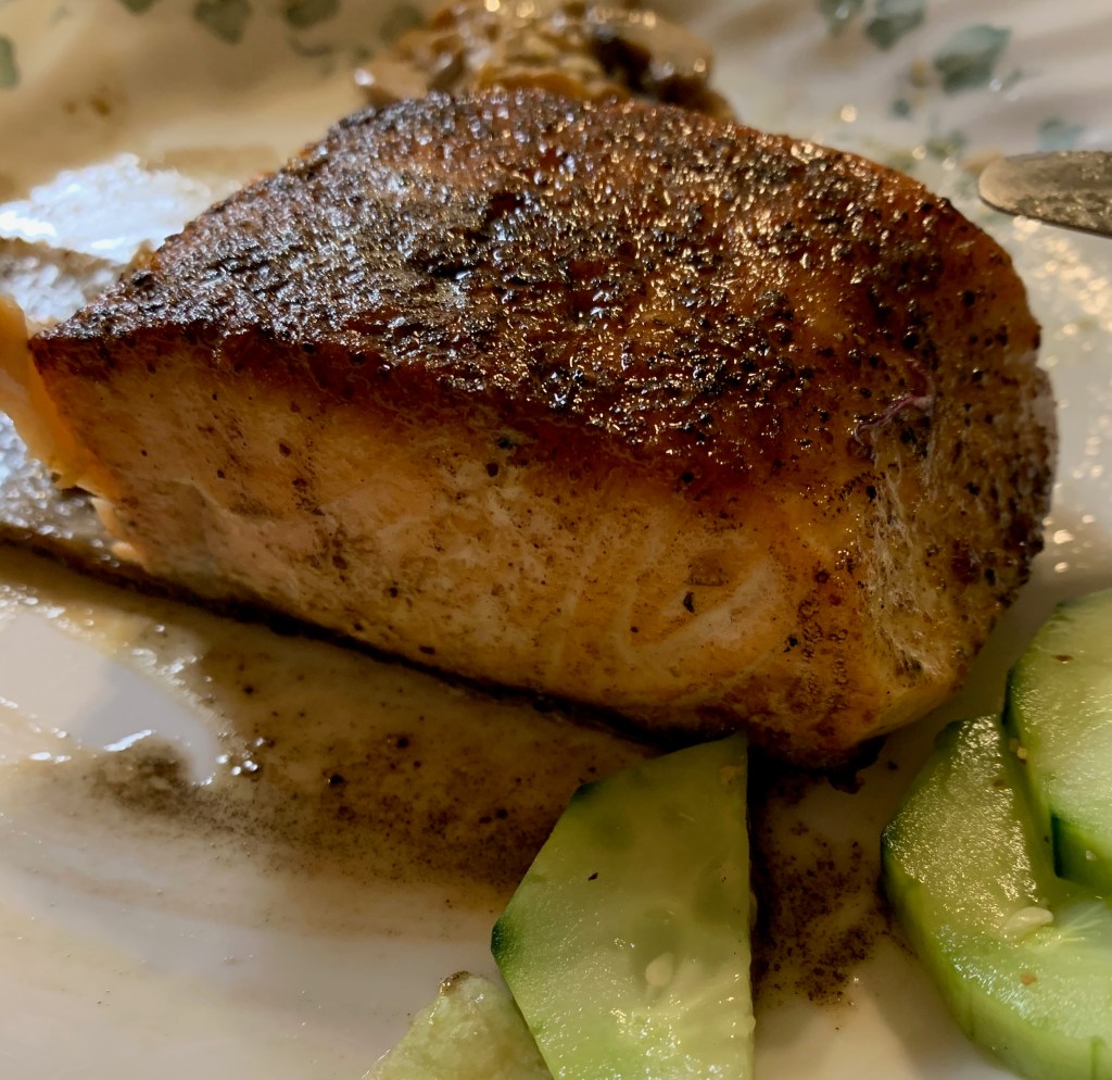 This recipe is for about 1 ½ pounds of salmon fillet. I sliced it in half for 2 generous servings.