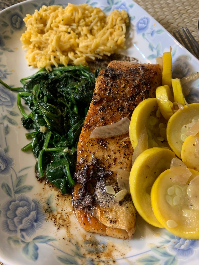 Heat a well-seasoned cast iron pan or a non-stick skillet on medium heat. Drizzle about 1 TBS. olive oil when the pan is hot and let the oil get hot again. Fry the salmon skin side up for about 7 minutes then turn over when the bottom looks golden brown. Fry the skin side for 2 minutes.