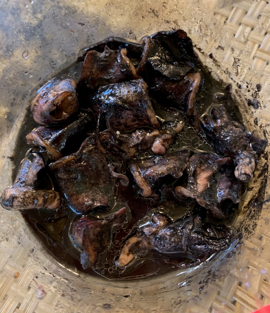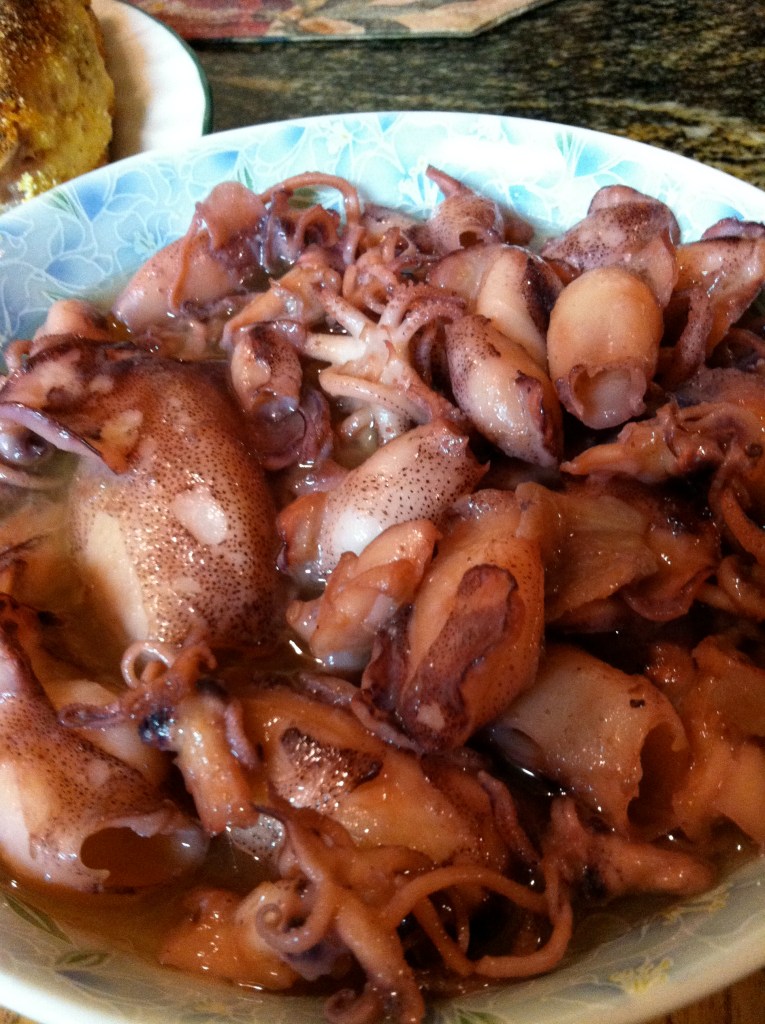 No matter how I tried to save these ink sacs and include them in cooking the dish, I have not attained a very dark or blue-black gravy and I am beginning to think I may be doing something wrong. But then, I wonder if there is a difference between the squids from the Atlantic or The Gulf of Mexico and squids from the Pacific? I know shrimp are different and so are oysters. Oysters are darker and have stronger flavor coming from the Pacific, like they have more iodine than from the Atlantic or the Gulf. I suppose it doesn’t matter.