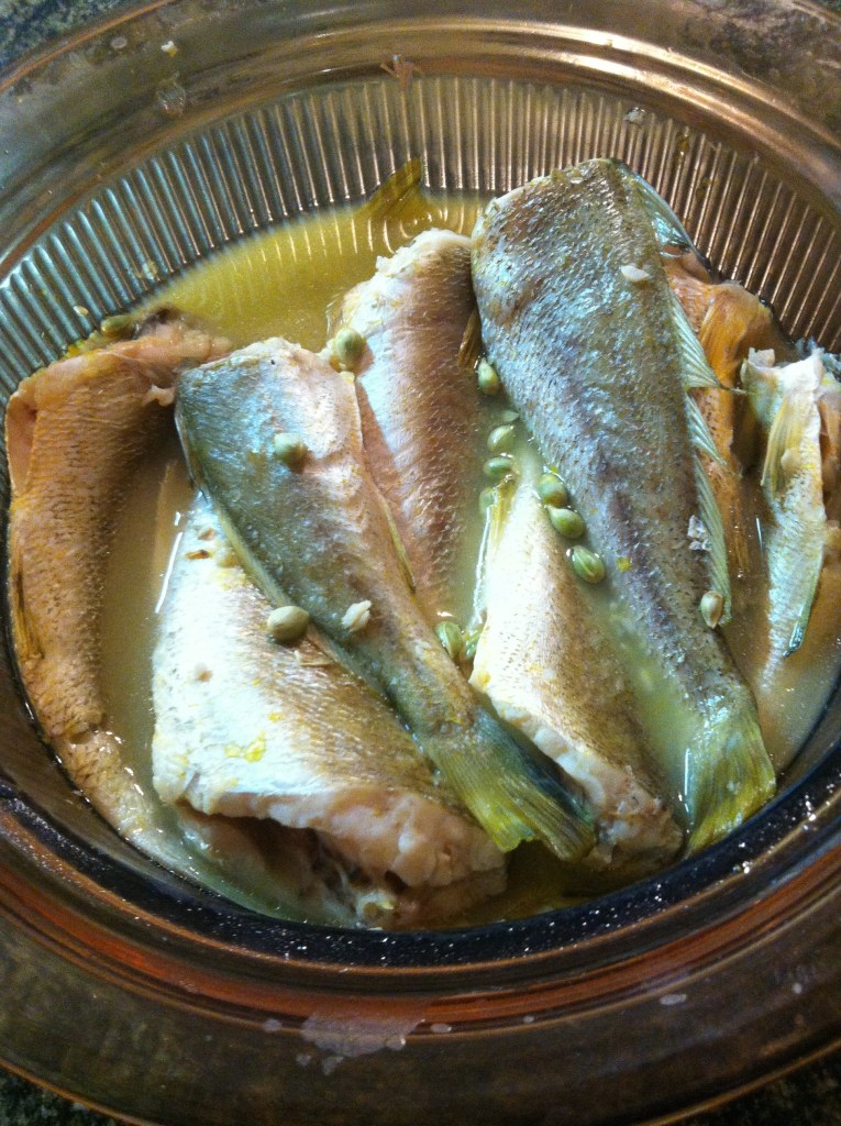 Layer the cleaned fishes in a non-corrosive pan. Sprinkle some salt (about 1/2 tsp) on them. Add 3 to 4 tablespoon of lemon juice or calamansi juice and about 1/2 cup water. Allow to boil then turn the heat down to low as soon as it boils. Cover and simmer for a few minutes until the fish are done, about 5 minutes making sure the fish don’t stick at the bottom. Taste and adjust the salt.