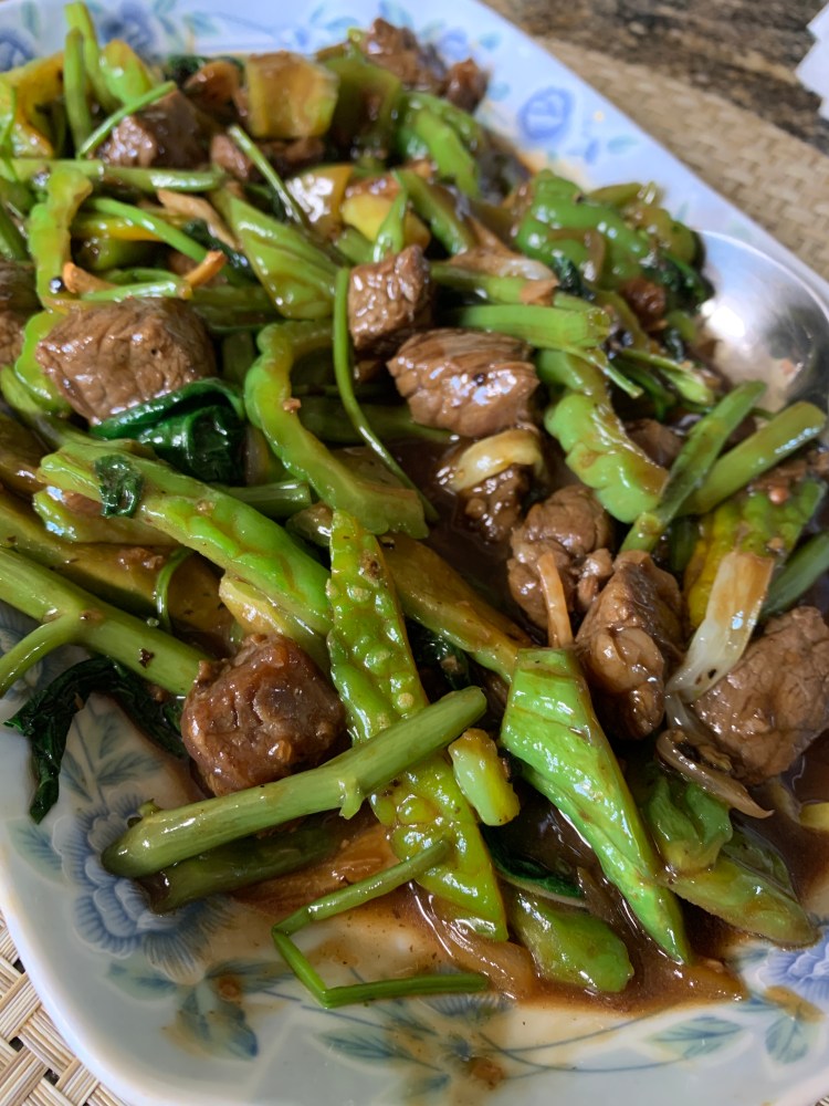 Ampalaya is bitter melon or Bitter gourd. Con carne is “with beef” (meat in Spanish). Now, I don’t know how a Chinese dish was named in Spanish and even the Chinese restaurants in Manila call it by that name.