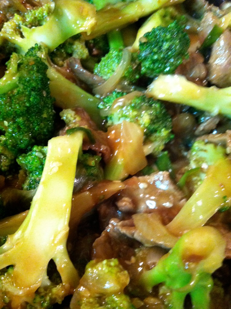 Stir in the onion, sauté until transparent then add the meat. Saute them together and when there are no more traces of red in the meat, add the oyster sauce mixture. Add the cooked broccoli, stir and toss for a few seconds or until heated through. Transfer to a plate and sprinkle toasted sesame seeds if desired.