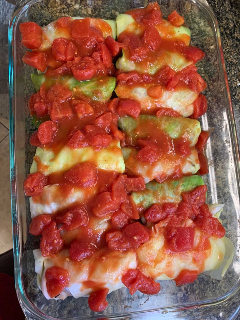 Place one cabbage leaf on a plate or cutting board. Place about ¼ cup of the meat. Roll the leaf over the meat and fold in the sides and roll it up. It’s like making an egg roll or a burrito. Place it in a baking pan, preferably a glass pan, seams side down. Repeat until all are rolled and placed in one layer in the baking dish.