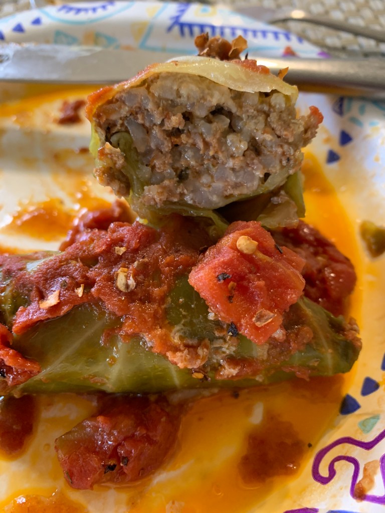If you don’t feel like messing with the cabbage leaves and rolling them like burritos or egg rolls, you can spread pieces of the cabbage leaves on a pan and cook it like a casserole.