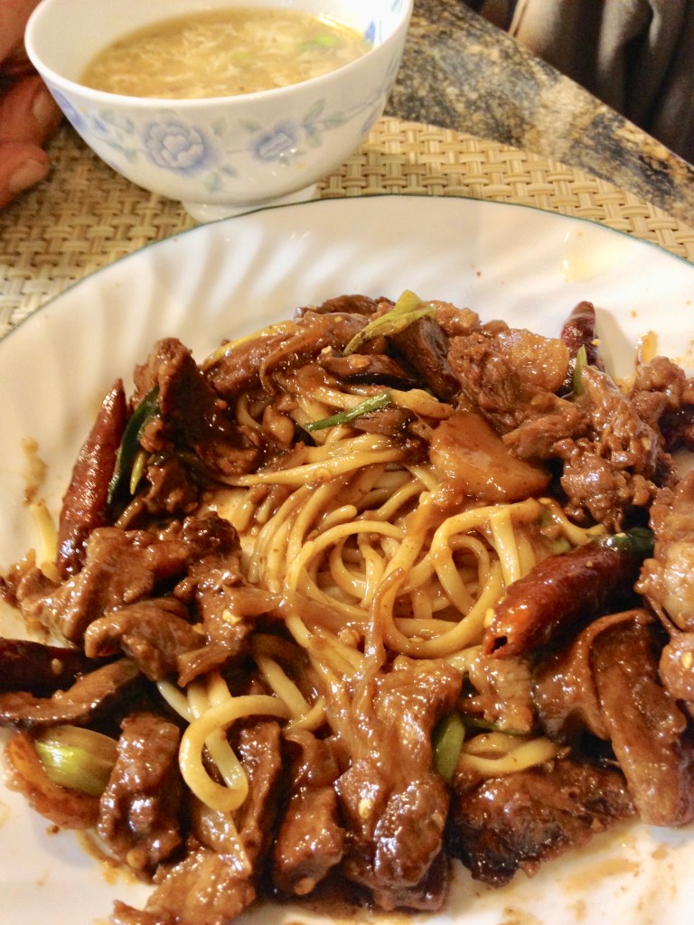 The Mongolian Beef on the left has both light and dark soy sauces for the marinade from the recipe above. Although the flavor is superb, it is too dark in my opinion.