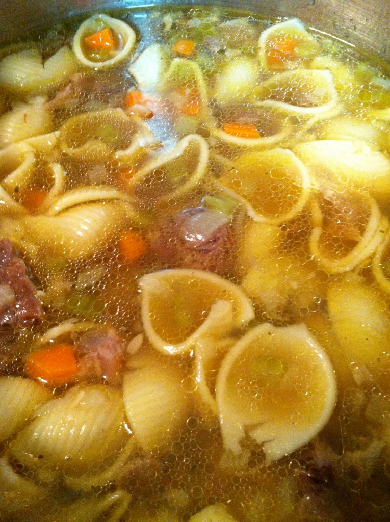 Drop 1 cup of medium shells into the boiling broth and boil until the shells are done and tender. Add the meat and season with 1 beef boullion if you had to add more water to the broth. Taste and season with salt and pepper. Add a dash of Maggi seasoning if desired. Add milk or cream to the soup as they sometimes do in the Philippines if you like.