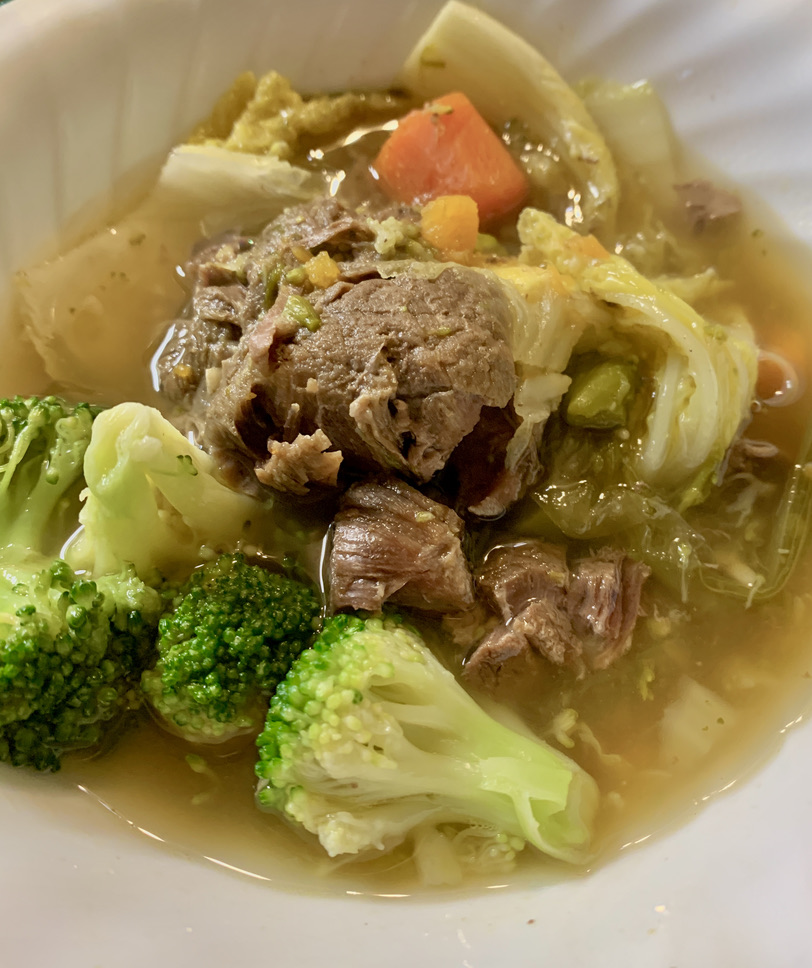 When the pressure cooker has cooled and the pressure returns to normal and can be opened, transfer to a different pot (your option) and return to boiling and drop in the potatoes and carrots if using. When they are cooked and done, add the cabbage, about ¼ of the head and the leaves cut or separated and other greens you like to add like bok choy. Taste and add salt if needed. Add a dash of MSG if you like. It makes a big difference in flavor. Or, you can add 1 beef bouillon cube. Let it dissolve in the broth then taste it before you add salt.