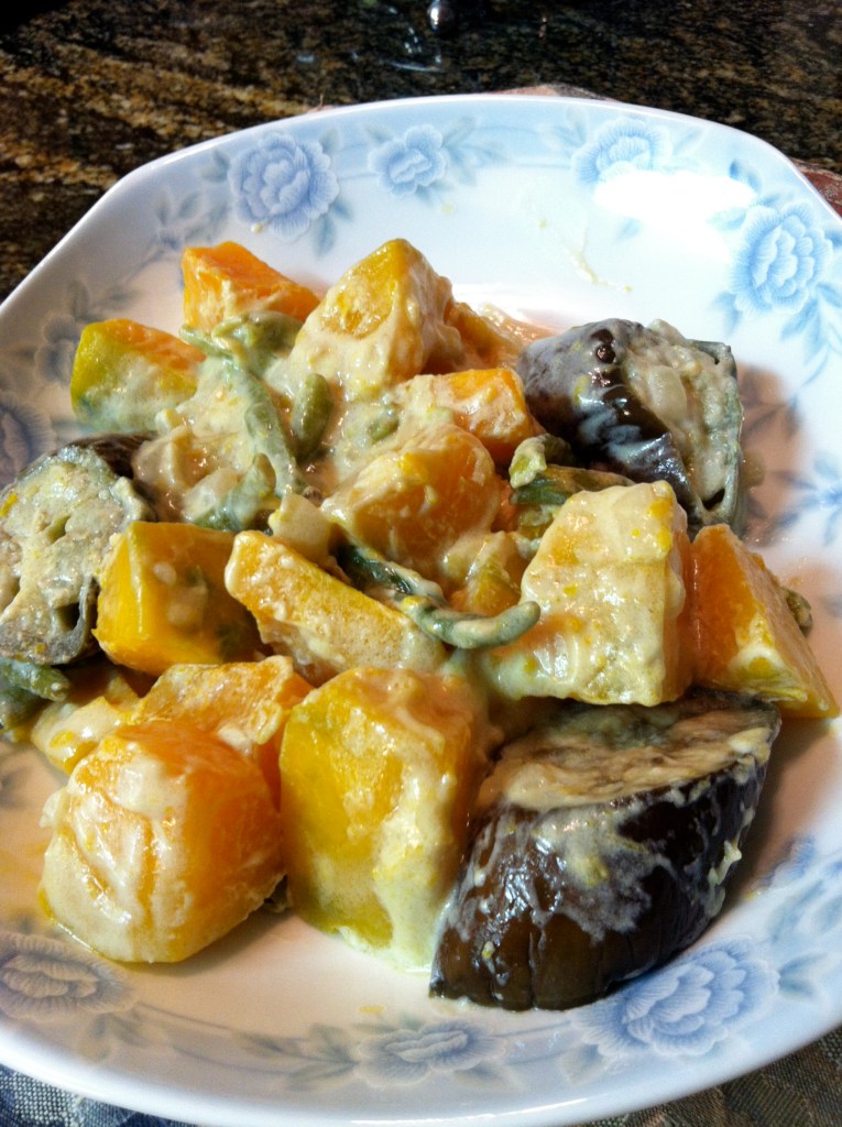This is how I cooked it and it tastes very good. The thickened milk sticks around the vegetables so that you can savor the blending of the rich coconut with the sweetness of the vegetable in each bite.
