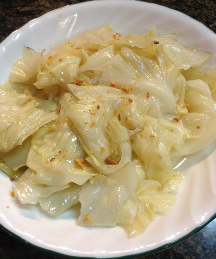 The other way is to cut up a half a head of cabbage. Sauté the garlic same as above, then add the vinegar solution and heat till it boils. Add the cabbage in the pan, cover and simmer for a couple of minutes. Turn the cabbages over and cook until tender crisp and serve. Garnish with bottled toasted garlic (bought from Asian market) or home fried garlic if desired.