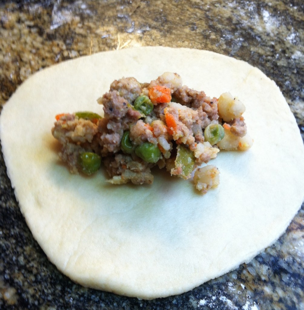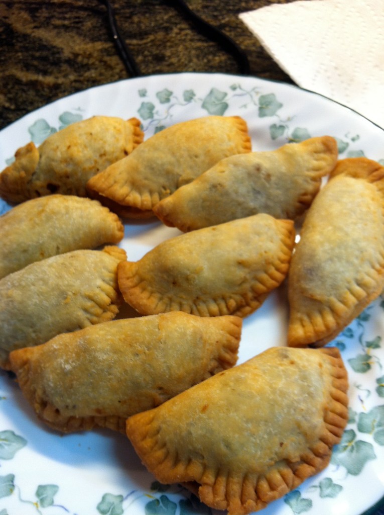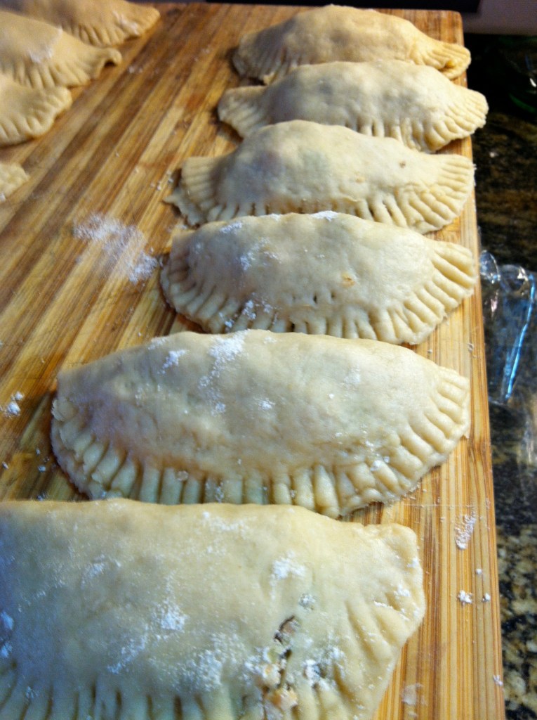 There, you made one empanada. Flour both surfaces and arrange on a cookie sheet and continue.