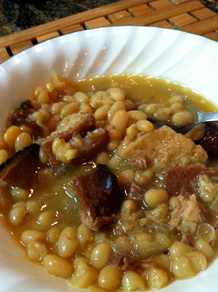 Papa sawed off the hock before the ham was boiled and used it to cook with Navy beans or Northern beans sometime after the holidays for another meal. He also cut-up the cooked and peeled off skin and used some of it in with the beans. I don’t think everybody knew how to make this and used the sawed off ham hock because my ex-husband’s family didn’t know what to do with the hock. They just threw it away.