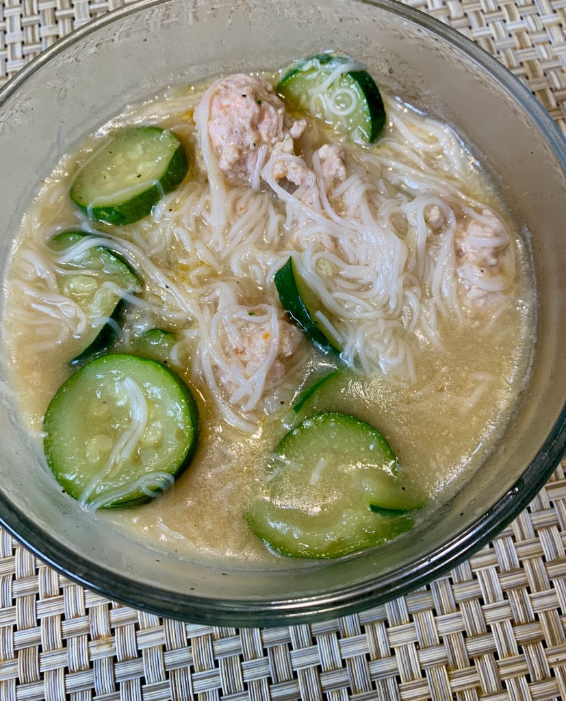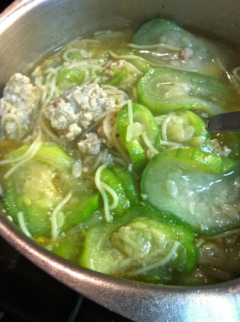 It is a soup with fine Chinese flour noodles available at Asian stores. The soup is cooked with pork meatballs usually with chopped or ground fresh shrimp, with or without other ingredients such as carrots, onions, and sometimes water chestnuts. It uses an egg as a binder. Slices of gourd or squash called Patola are added last. Patola (click to take you to Glossary link) becomes loofa when it matures and dries. The squash or the gourd has to be picked very young for eating otherwise it will be very stringy. Another variety is called Chinese okra because it has ridges but it is almost the same as the smooth skinned patola.