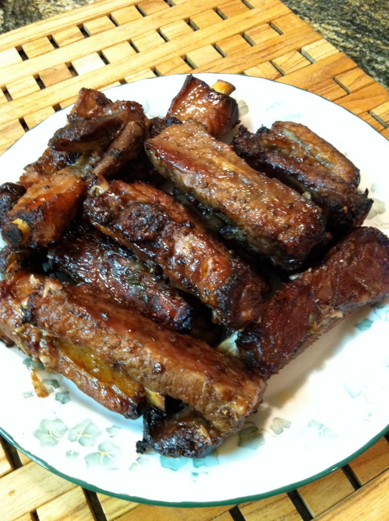 Brush the ribs on both sides with 2 TBS Honey. Hook the ribs to the oven rack and roast for 30 minutes at 275°F, another 30 minutes at 300°F, and finally for 10 minutes at 400°F. Serve hot or cold and cut for appetizer.