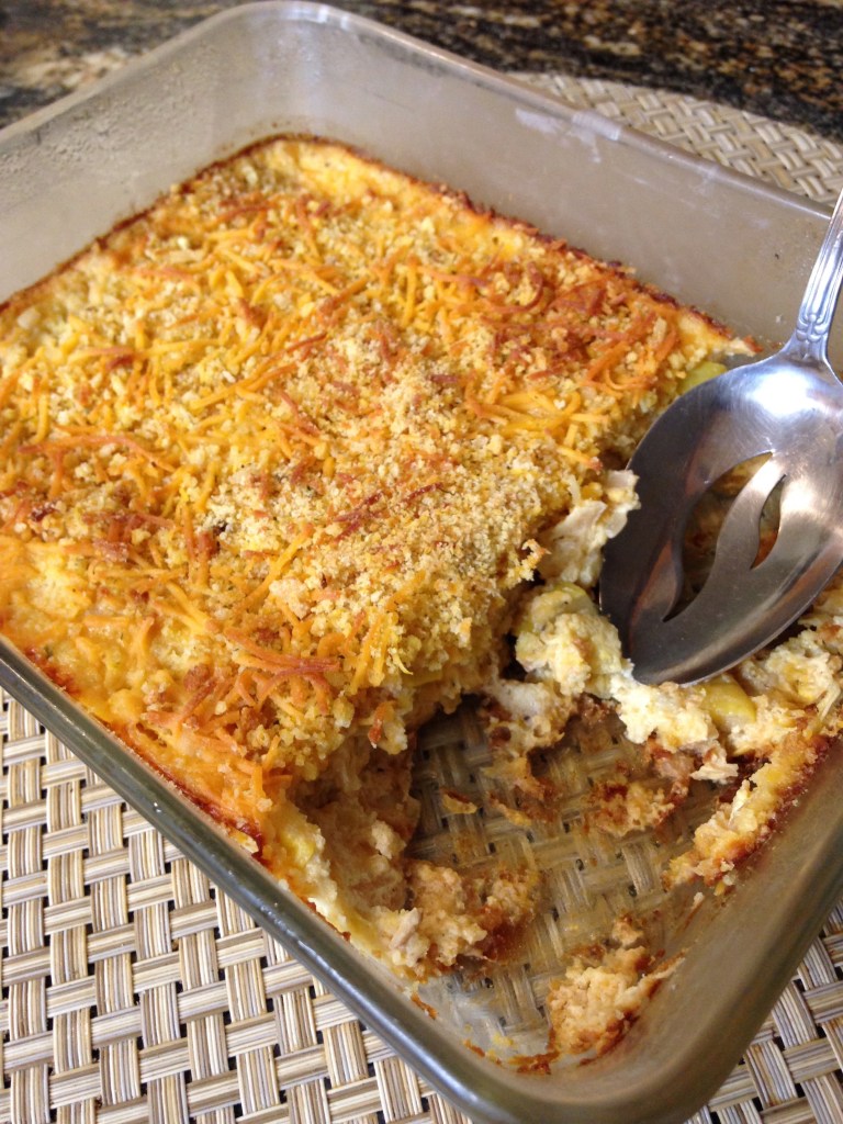 To one half of the mixture, add the slightly beaten egg, milk and sour cream. Add in the cooked squash and mix thoroughly. Transfer to a greased baking pan (a glass pan is good). Sprinkle the half of the bread crumb/cheese mixture on top. Bake in 400°F preheated oven for 20 to 25 minutes or until the crumbs are slightly browned.