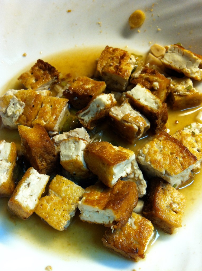 Cut up the fried tofu in cubes and add to the vinegar mixture. Stir to coat all the tofu.