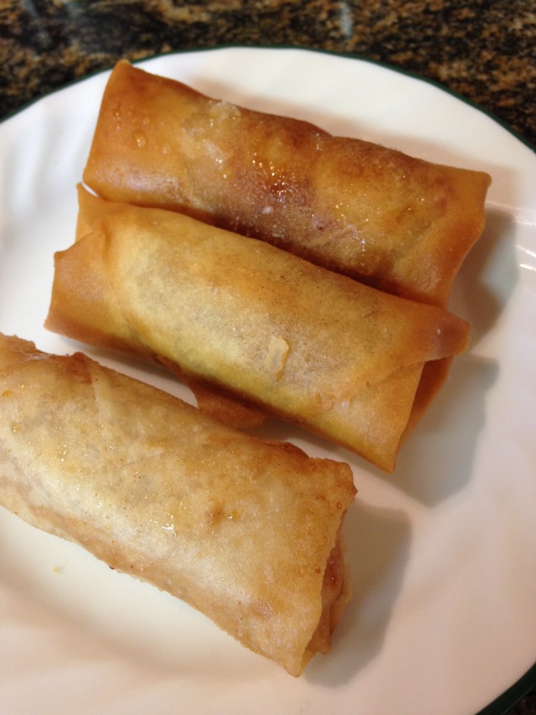 Split the bananas lengthwise, roll in sugar with or without cinnamon, wrap in Lumpia wrapper then deep fry. Some add sugar on the wrapper or in the oil while frying to coat the wrapper with streaks of caramel.