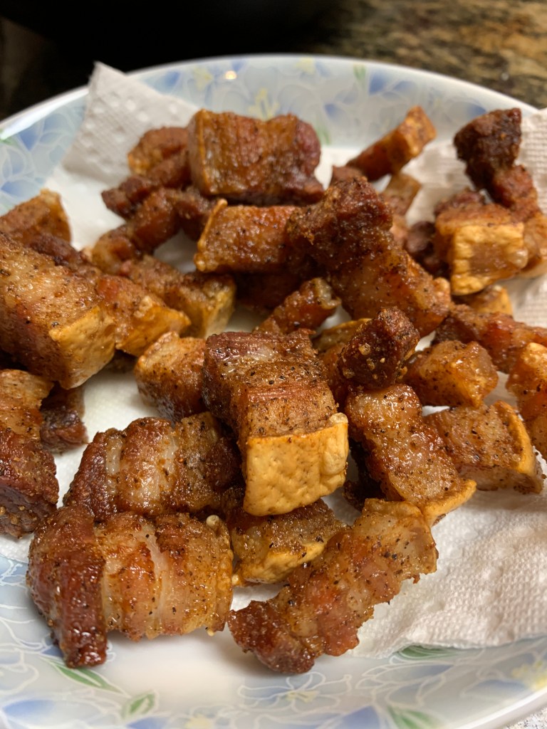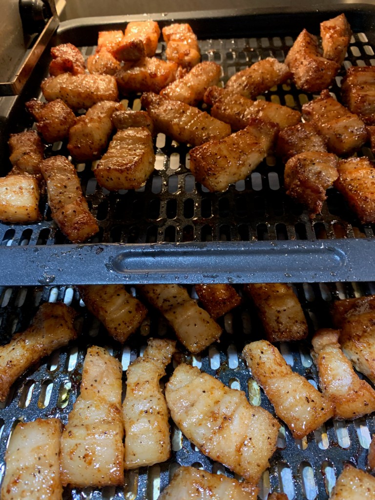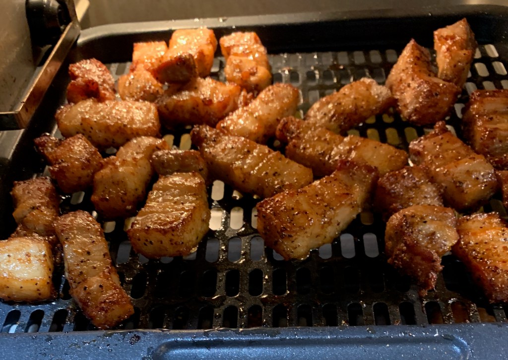 I repeated the recipe using pork belly from an Asian store with the rind attached and the result is below. It’s almost having lechon if I had the lechon sauce. But it is very good with those crispy skins. Cooking in the air-fryer surely saves time and healthier too, because they are not deep fried in oil.