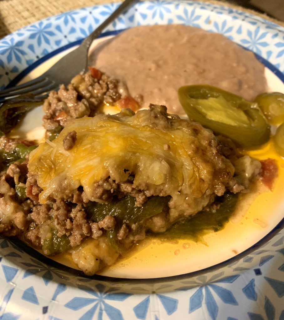 This is my own version/concoction of Chile Relleno made as a casserole.