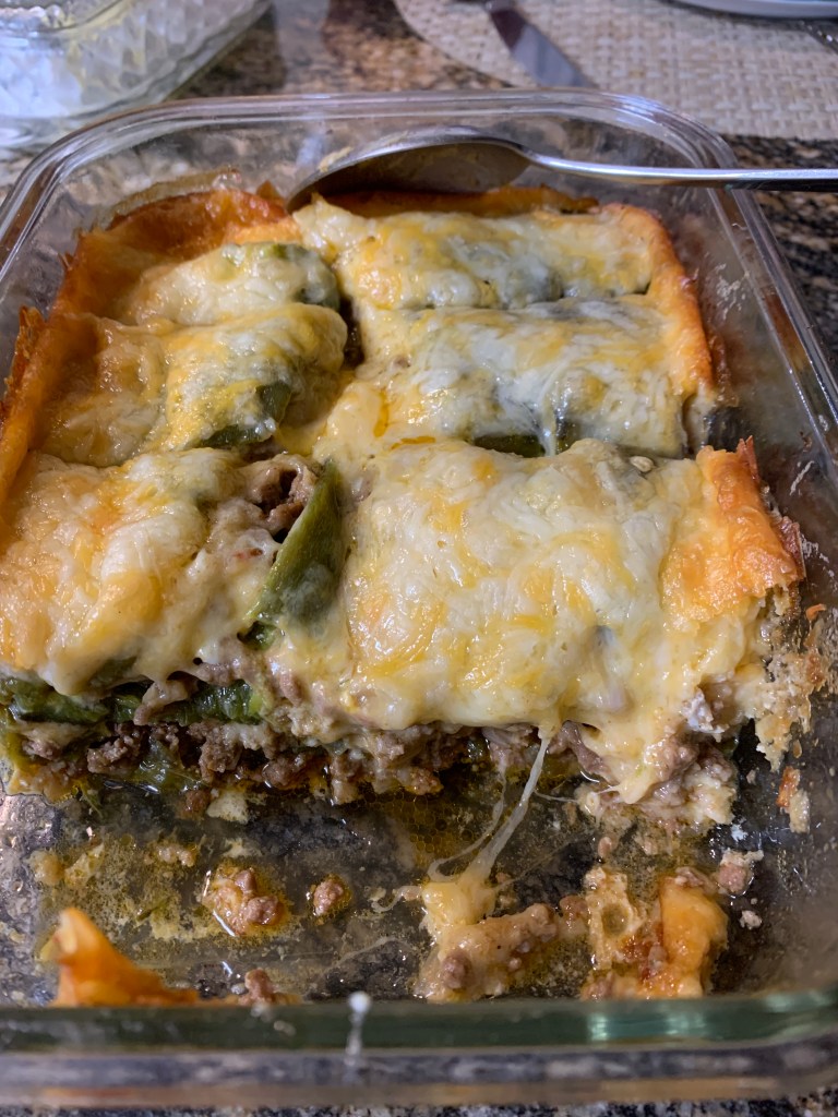 Slice the poblano peppers in half so you could arrange one half one way and the other half the opposite way to fit the bottom of a baking dish. Make one layer of the pepper then add the beef mixed with the eggs. Add another layer of poblano on top and repeat ending with poblano as many poblano pieces you have. End with the cheese spread uniformly on top of the poblanos.
