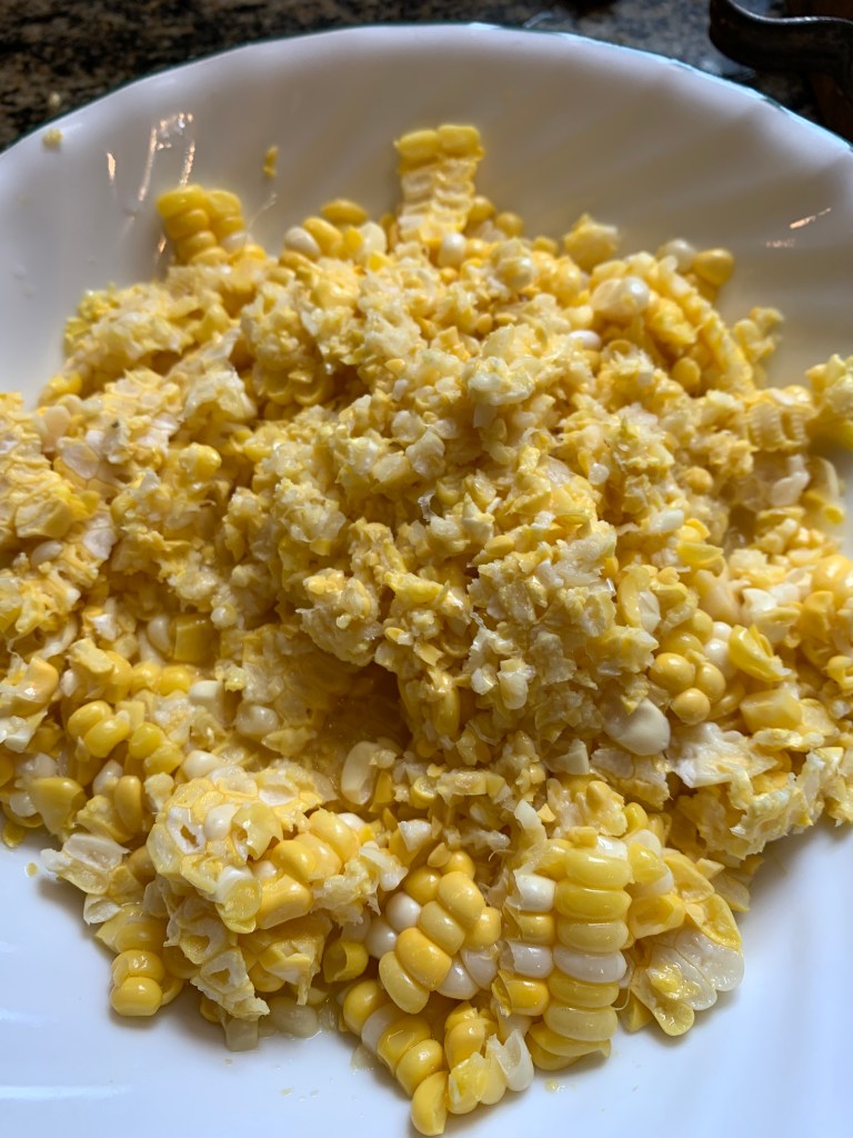Shave the corn kernels from the cob using a sharp knife. To shave off the cream from the cob I used a vegetable or potato peeler. Scrape as much as you can and separate them from some of the larger pieces. Save some of the larger pieces aside for later.