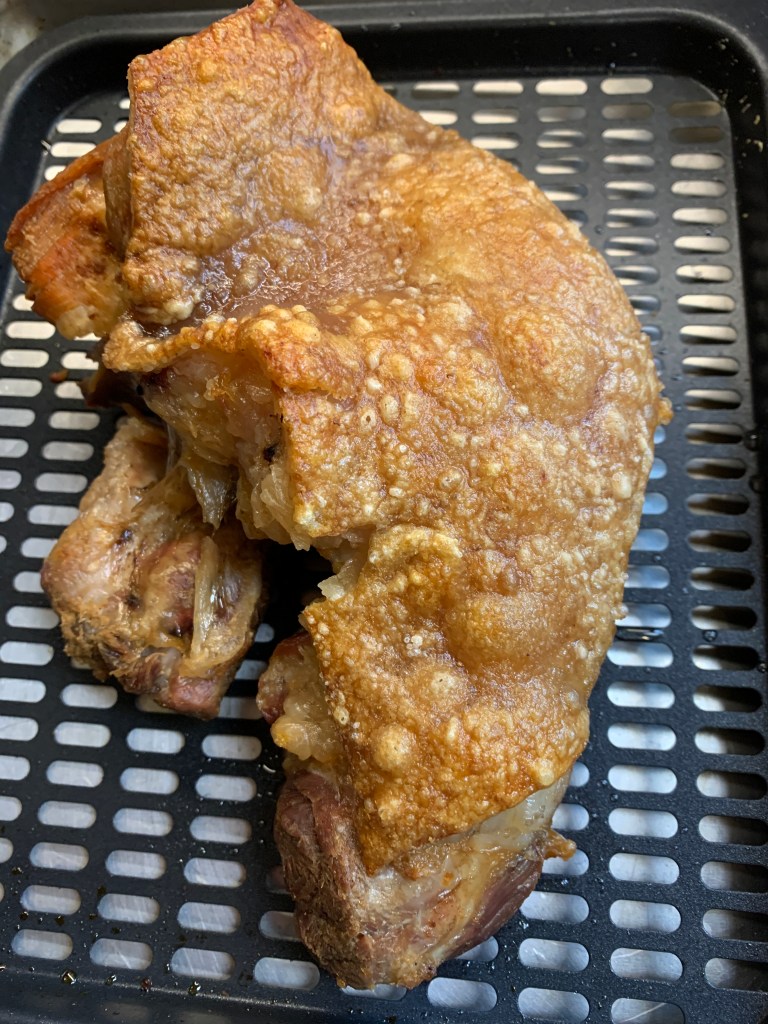 Deep frying with pork skin is dangerous because the oil will pop, explode and splatter, hopefully not on your face. This is the reason why I did not try to make this dish because I am afraid of the oil exploding on me. I came up with the idea of air frying it and it turned out perfect. That is, if your meat portion will fit in your air fryer and not so big. Otherwise, you can use an oven.