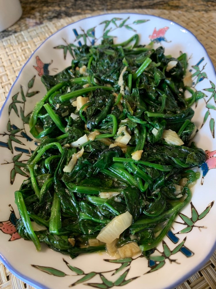 On medium heat, melt the butter in a skillet. Sauté the garlic until fragrant but not browned. Add the spinach a handful at a time and wait for them to wilt before adding some more. This is to prevent the spinach from falling off the skillet. Use tongs to turn them over and stir frequently to avoid burning the garlic on the bottom. The volume will decrease considerably. It’s done when the leaves wilt and become soft. Salt to taste and add pepper if desired.