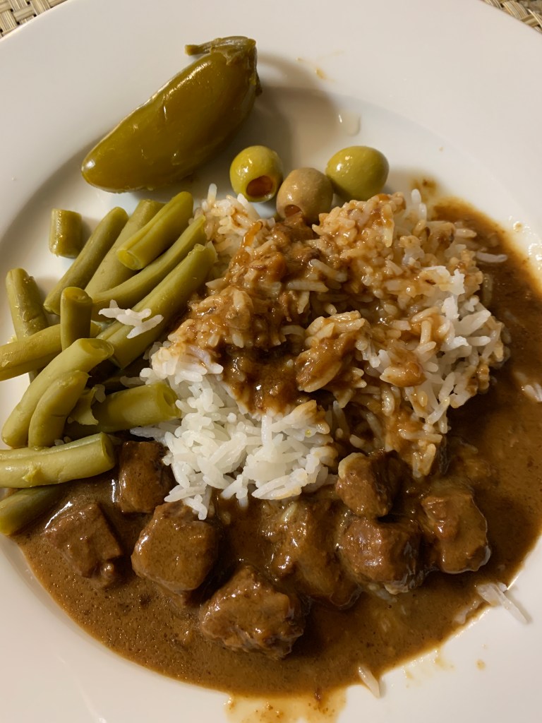 This dish can use the less expensive cut of beef like top sirloin steak or rump roast or chuck roast. I used a small portion of a chuck roast, a little over 1 lb. , which is just right for two to four people. Of course, it is served over rice or mashed potatoes. Southern people like it over rice where you put the gravy and the meat on top of rice. For the purists, use short grain rice and cook it as Americans do. Or, you can use the parboiled instant rice in a box. I used long grain Jasmine rice here.