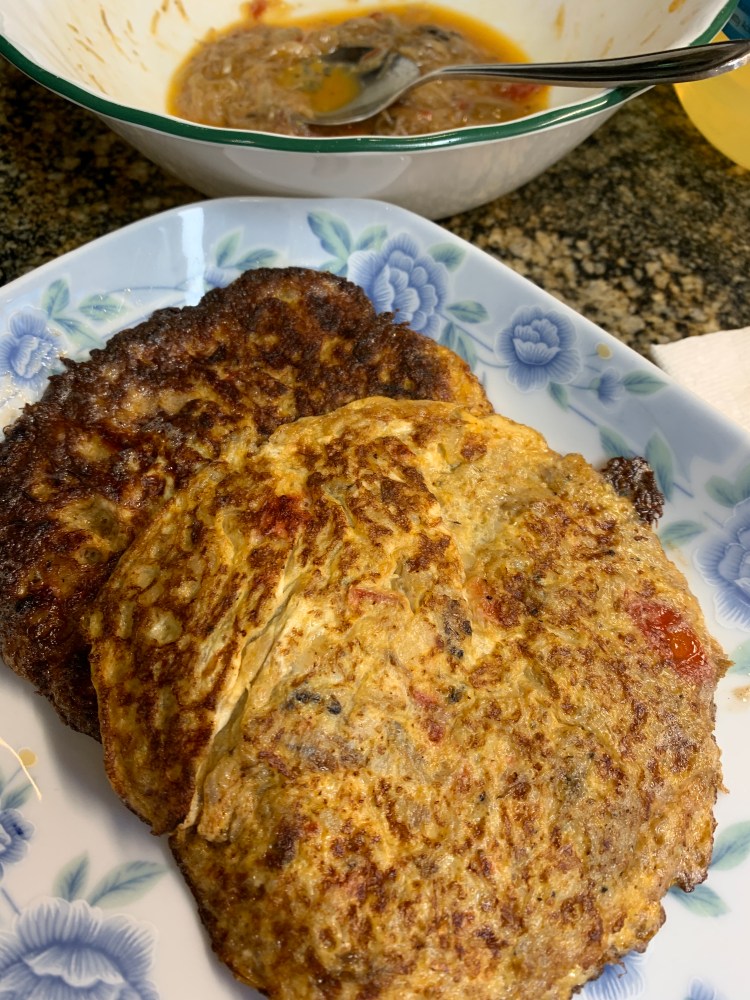 This recipe makes 3 to 4 patties. You can double the recipe if you need to cook more. You can also add some vegetables like chopped celery, carrot sticks and/or chopped peppers if you like to increase the volume but use more eggs.