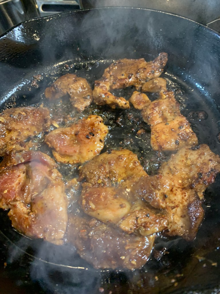 Heat a heavy skillet like a cast iron pan. Add a tablespoon oil in the pan and spread it well. On medium-high heat, individually place the pork slices in the pan and sear both sides. Keep them separated and don’t crowd them. Do them in bactches and use a thin layer or cooking oil on the pan each time you do a batch to prevent sticking.