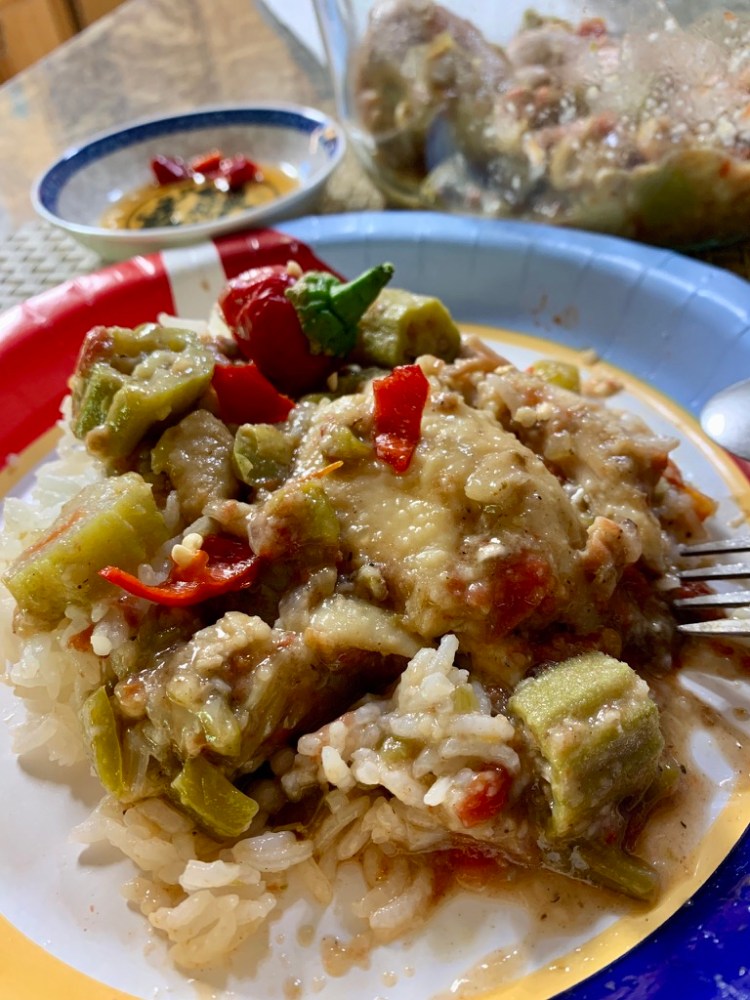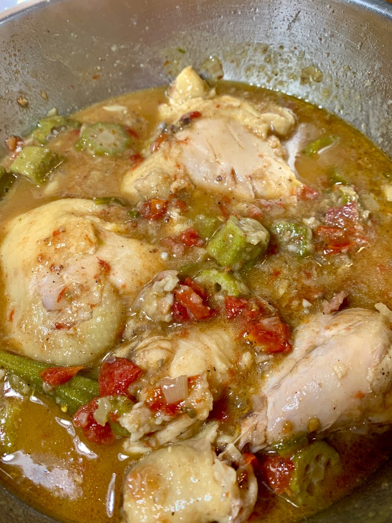 This dish does not really require okra but I have been harvesting a few okra from my garden each day. I only have a few okra plants that have been giving me one okra per plant but it is a joy to pick them every morning. Since I have already collected a few of them and we are tired of fried okra, I decided to make stewed okra that was very delicious. However, there was still some leftover stewed okra that I did not want to waste. I thought I would try cooking stewed chicken like this and I’d include the leftover stewed okra. It was so delicious I decided to write down the recipe lest I forget what went in it and how I cooked it.