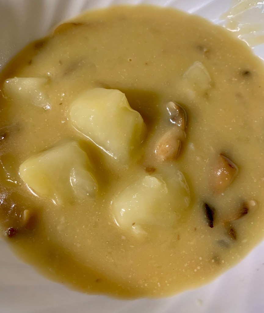In a larger soup pot, about 2 to 3 quart size, add both the Cream of Mushroom Soup and the Cream of Chicken Soup. Add 2 cans of water or broth and stir until well mixed. Add the sauted onions and garlic then add the potato chunks and the can of mushroom. Heat to boiling, drop in the chicken bouillon then turn the heat down and simmer covered for about 30 minutes or until the potatoes are done and tender. Stir occasionally to prevent potatoes from burning and sticking to the pot.