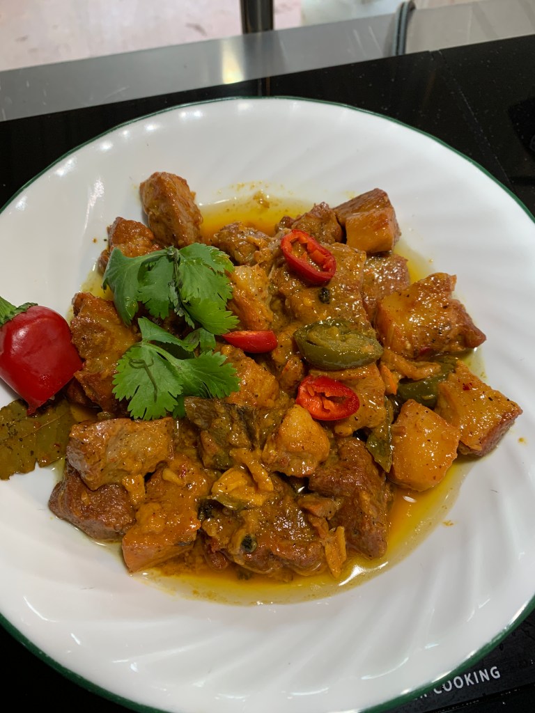 When the pork or meat is tender, you can add a few pieces of cut up chilies if you like. If there is any watery sauce left, raise the temperature a little and continue to boil and stir uncovered until there is no more water left but fat. But it is all up to you and how you like it.
