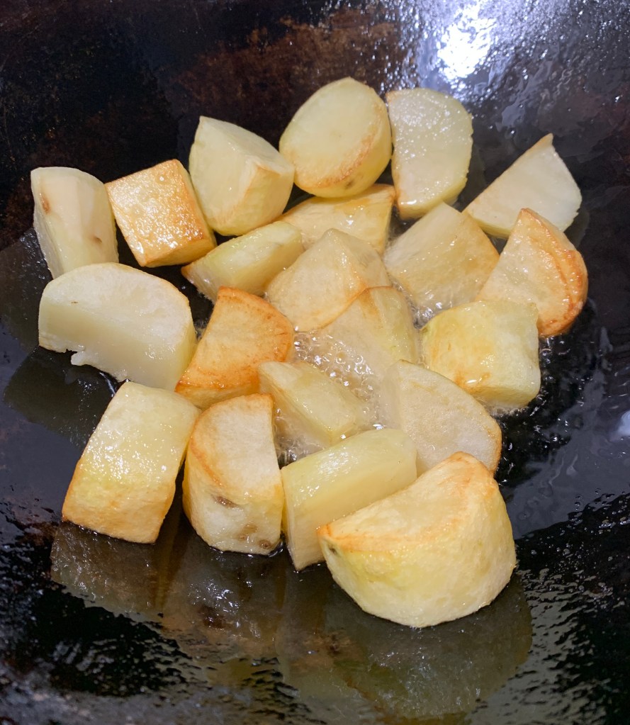You may also add some pre-fried chunks of potatoes in it if you like. Pre-fry the potatoes to brown but not completely cooked. Set them aside. Add them at about the end of the cooking, just before the meat gets tender and continue to simmer until the potatoes are done and the meat is tender.
