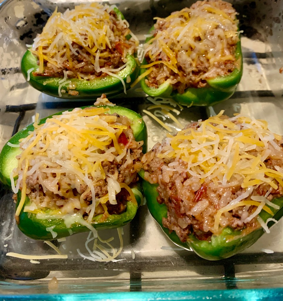 Then I remembered my husband had told me a long time ago that he hates stuffed bell peppers and never liked them. He said it never tasted good to him. I made them anyway but only a small batch so in case he didn’t eat them I wouldn’t have to eat them for several days myself.
