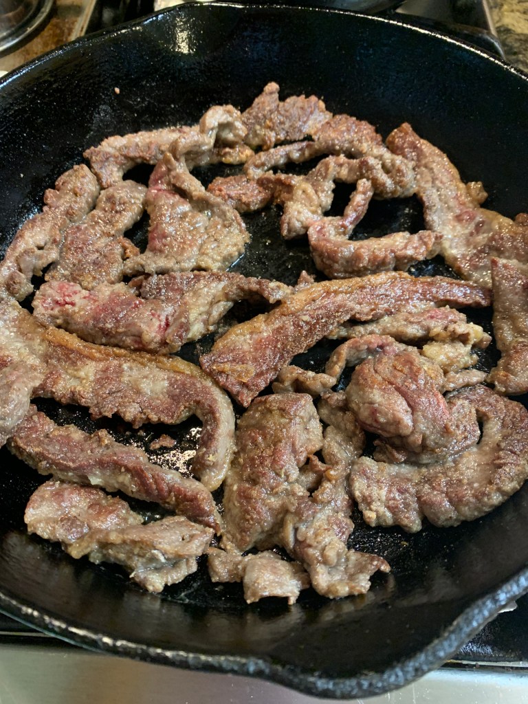 - Beef, cut in thin strips about ¼ in. thick. Choice of cut is sirloin steak or NY steak